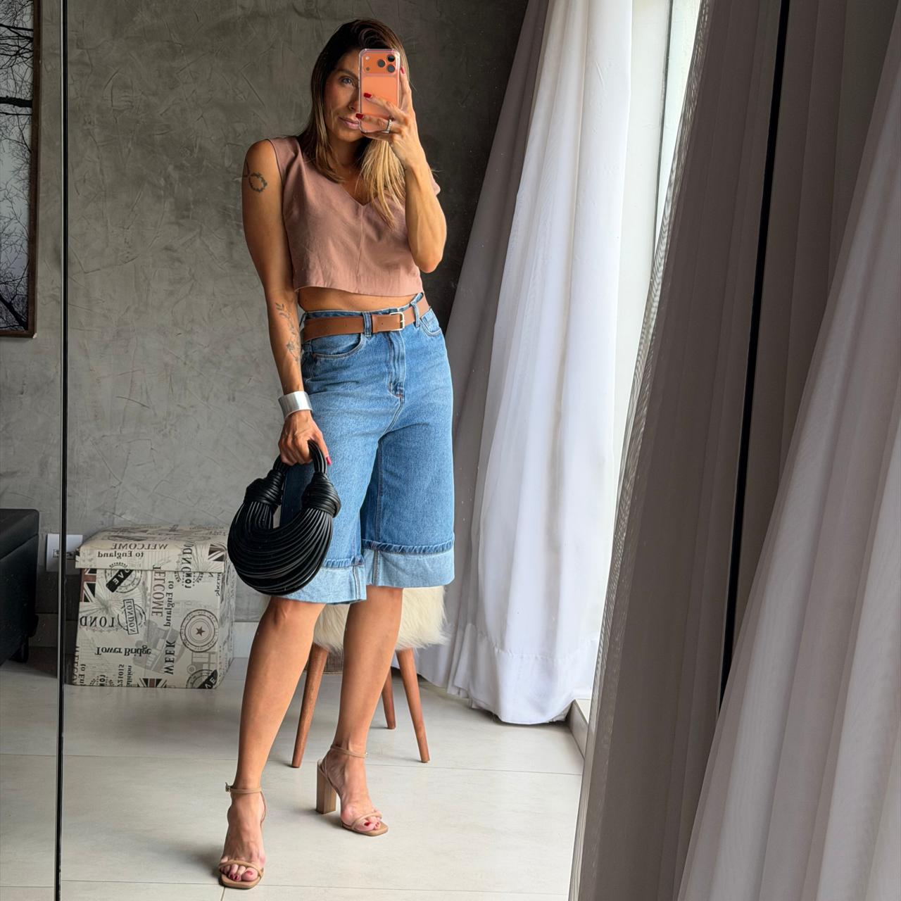 Bermuda Jeans. Lavagem média. Modelo Jorts ( Boyfriend). Jeans Denim (algodao) e elastano. Detalhe da barra dobrada. Bolsos na frente e atrás.