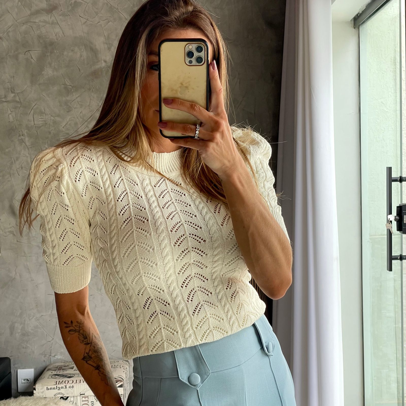 Blusa comprimento normal. Manguinha. Gola redonda. Trama toda trabalhada. Tecido tricot Modal (linha). Com elastano. Tamanho Unico (veste P ao G)