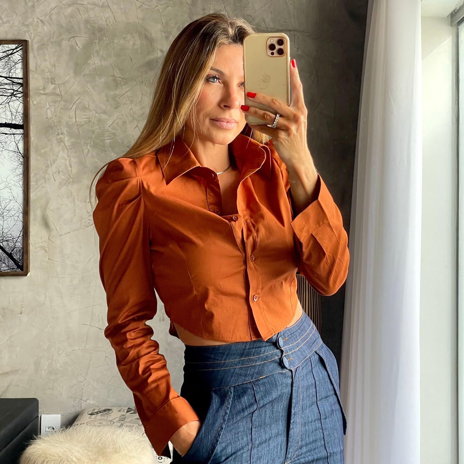 Camisa manga comprida. Ombro princesa. Tecido tricoline com elastano.