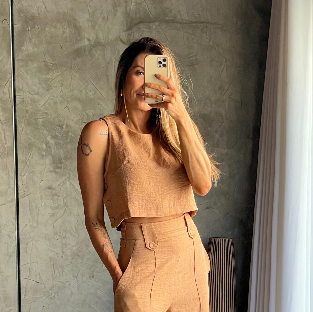 Blusa cropped. Tecido Crepe. Detalhe Botoes na lateral.