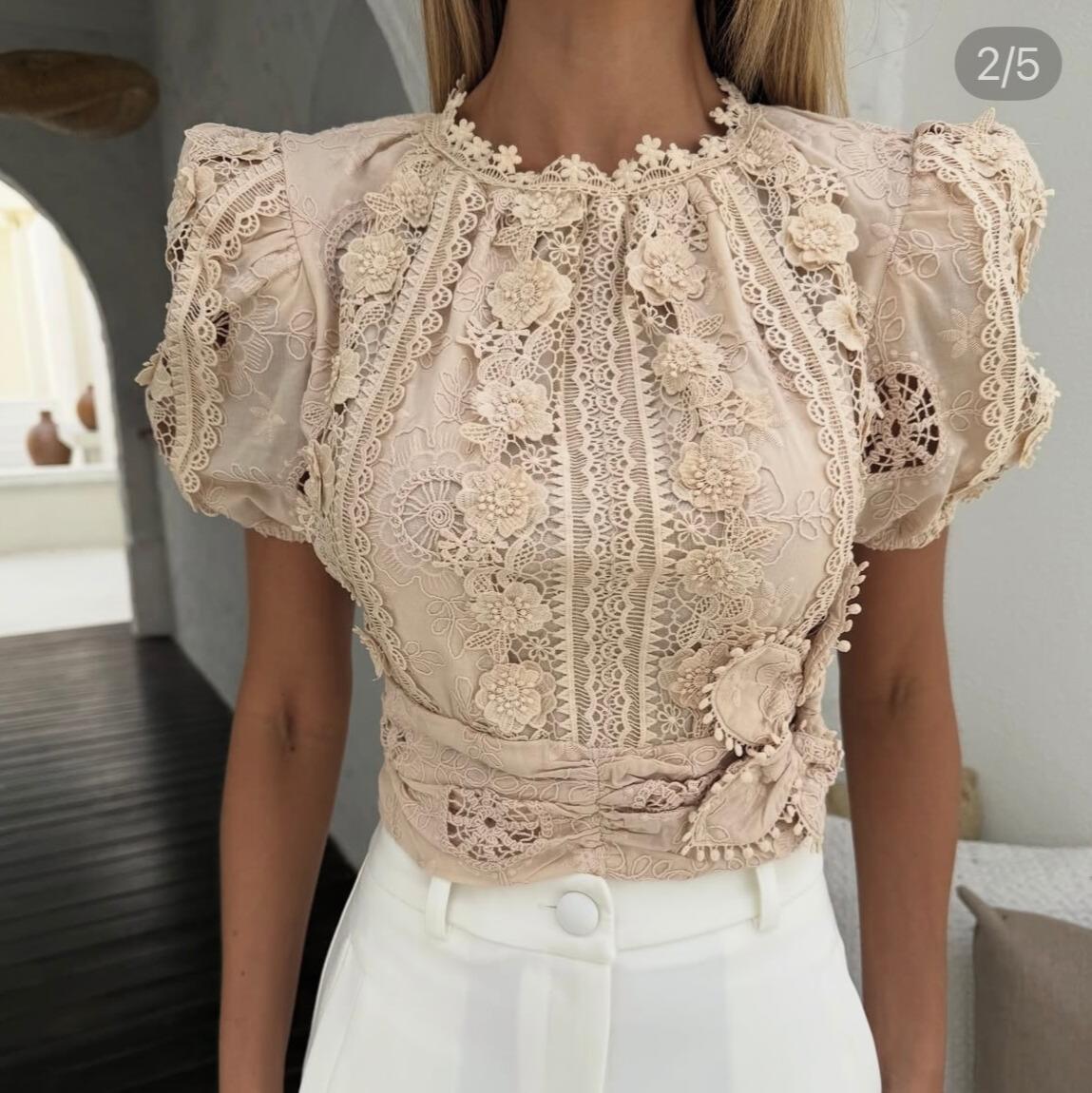 Blusa Cropped mais comprido. Tecido Laise. Bordados em forma de flor. Detalhes em Rechilieu. Manguinha curta. Sem decote.. Fecha com ziper atras. Tamanhos: P, M e G.