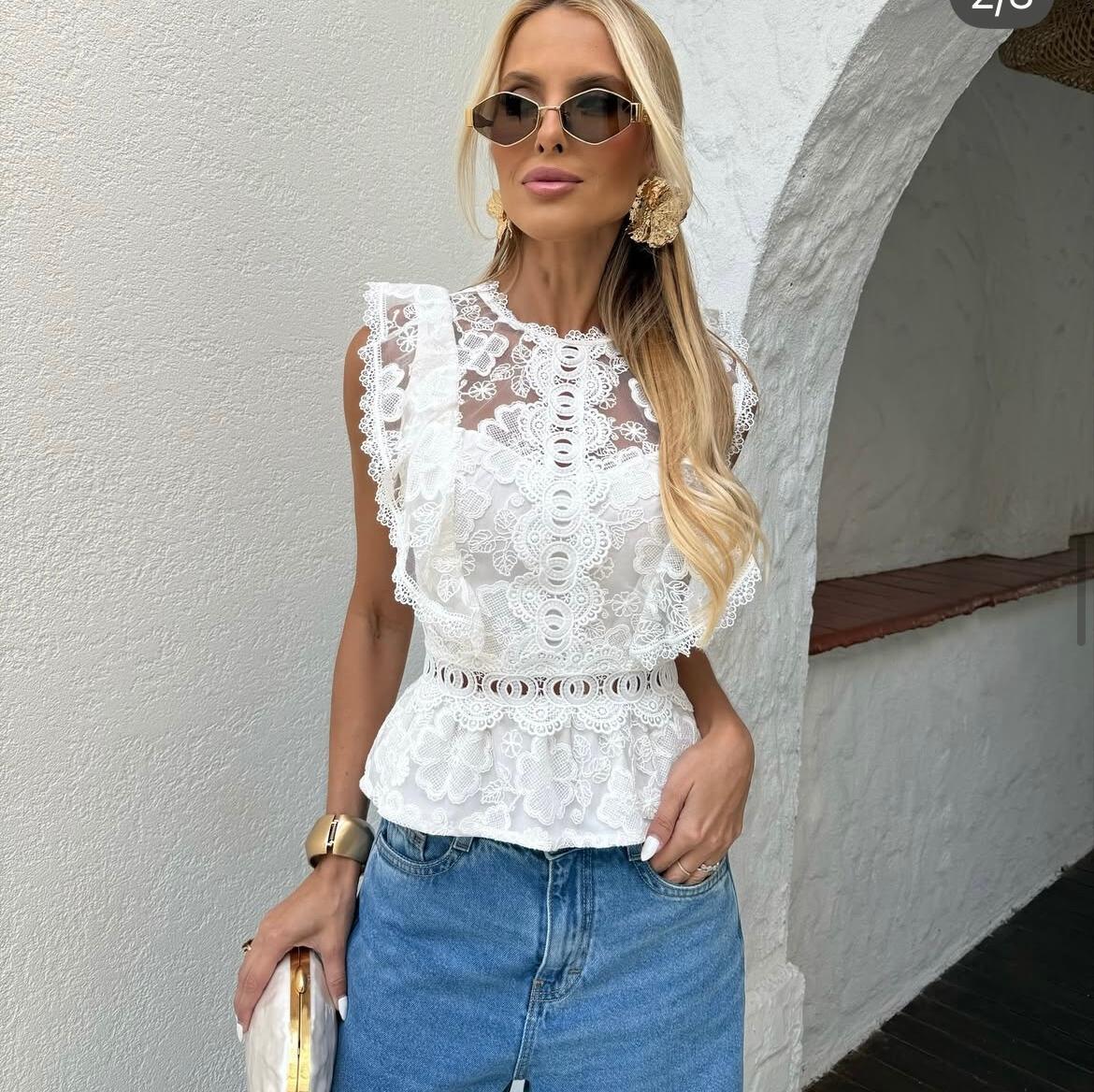 Regata comprida (comprimento normal). Cor BRANCA. Acinturada. Tecido Renda com detalhes em laise. Peça com tecido delicado e corte feminina. Ombros marcados (babado discreto).