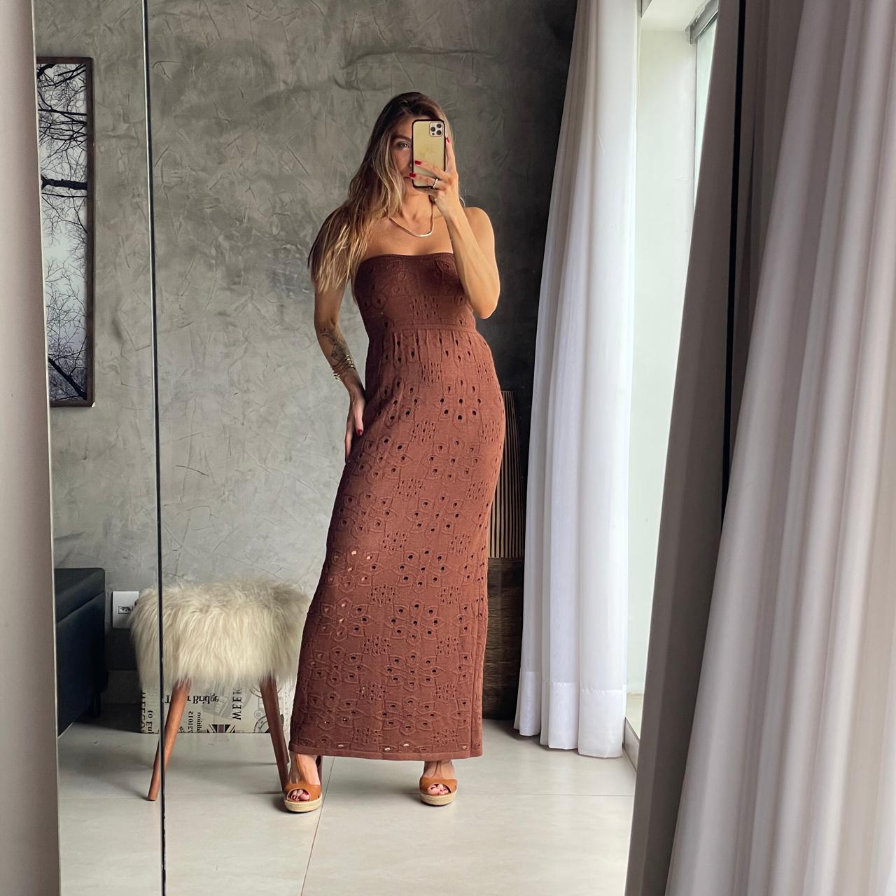 Vestido Longo. Tecido tricot modal (elastano que modela o corpo) Tomara que caia. Somente na cor marrom. Tamanho UNICO (veste P ao G tranquilamente).
